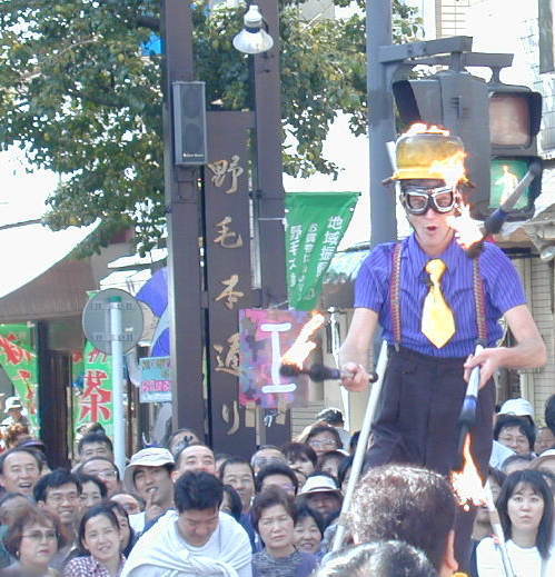 火を吐く芸は有りがちだけど、種火が頭上にあるのがポイント!? 最後の最後に本物のハトを出して、観客は感嘆で口あんぐり!! もちろん「投げ銭」!!
