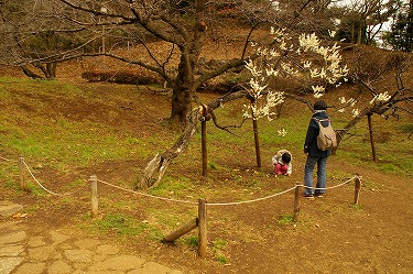 梅の香りを楽しむのどかな平日の風景です。 これは冬至梅です。